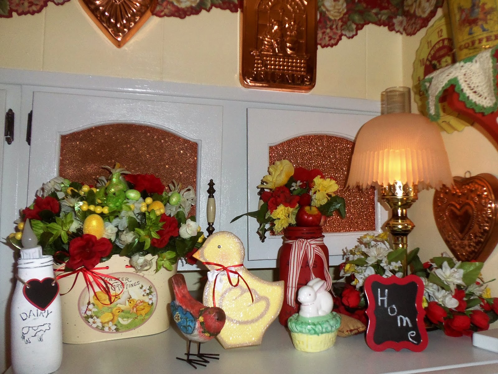 My Kitchen is mainly red and yellow with a touch of green so trying to find Easter decorations to go with those colors has been a challenge but over the years, I have collected a few things......