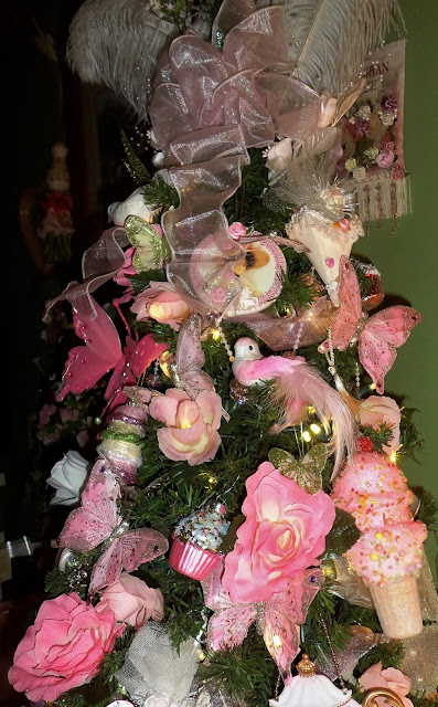I topped off the Tree with a bow made from a shimmery pink ribbon, feathers and a sprig of flowers......