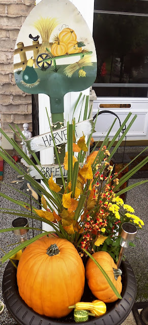 Then I stuck a Fall decorated shovel in the back and threw in 2 solar lights for night time lighting..............