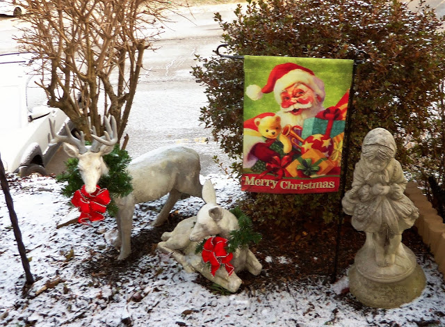 We had a bit of ice and a dusting of snow last night but since temps. would be rising above freezing today, I felt it was opportunity to switch over the outside Christmas decorations to Winter decorations especially since Joe was home and could take down things to our Storage shed that we rent......