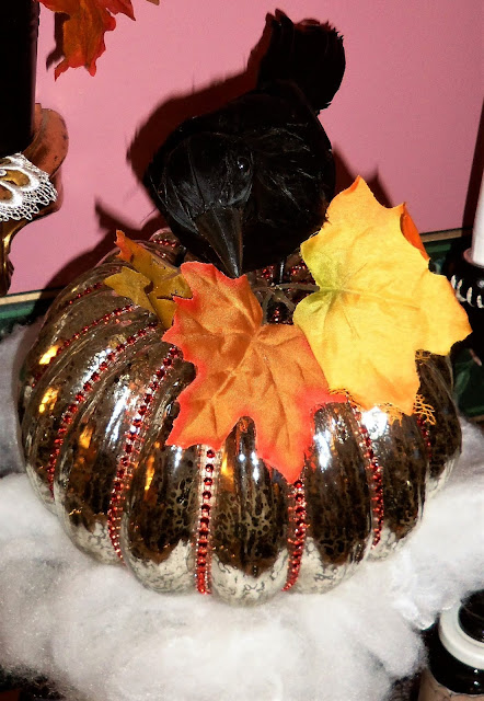 I embellished the pumpkin with orange rhinestone trim that I found in the Dollar Bins in Micheal's.....