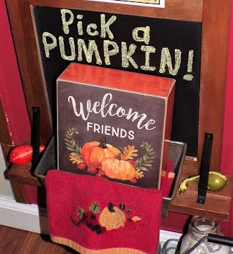On the shelf in a vintage loaf pan is a Fall towel and a cute wooden block......