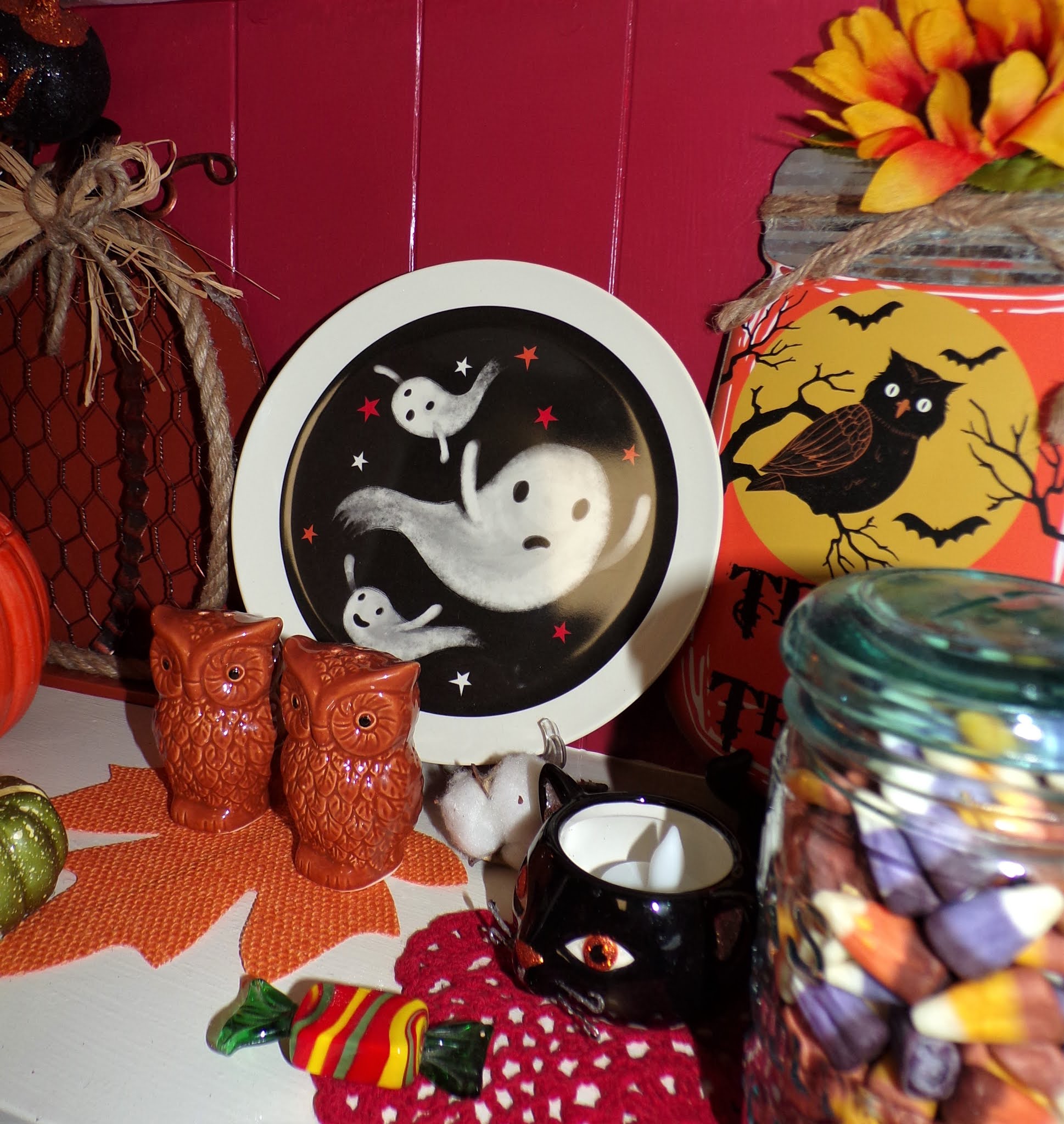 I filled a mason jar with candy corn and the Halloween dish was one of a set of 4 bought at Target.....