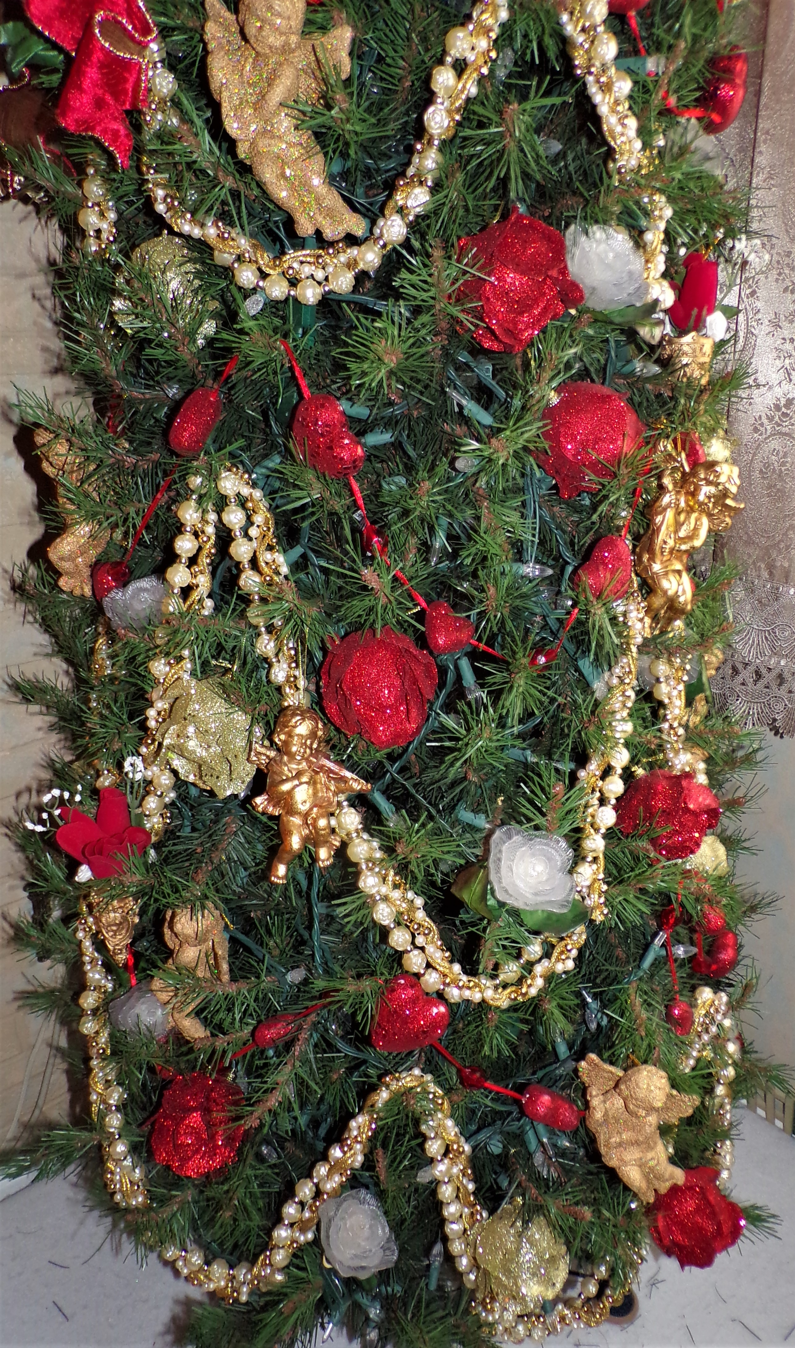 The Tree is topped with a bow made from red velvet ribbon, embossed with roses.....