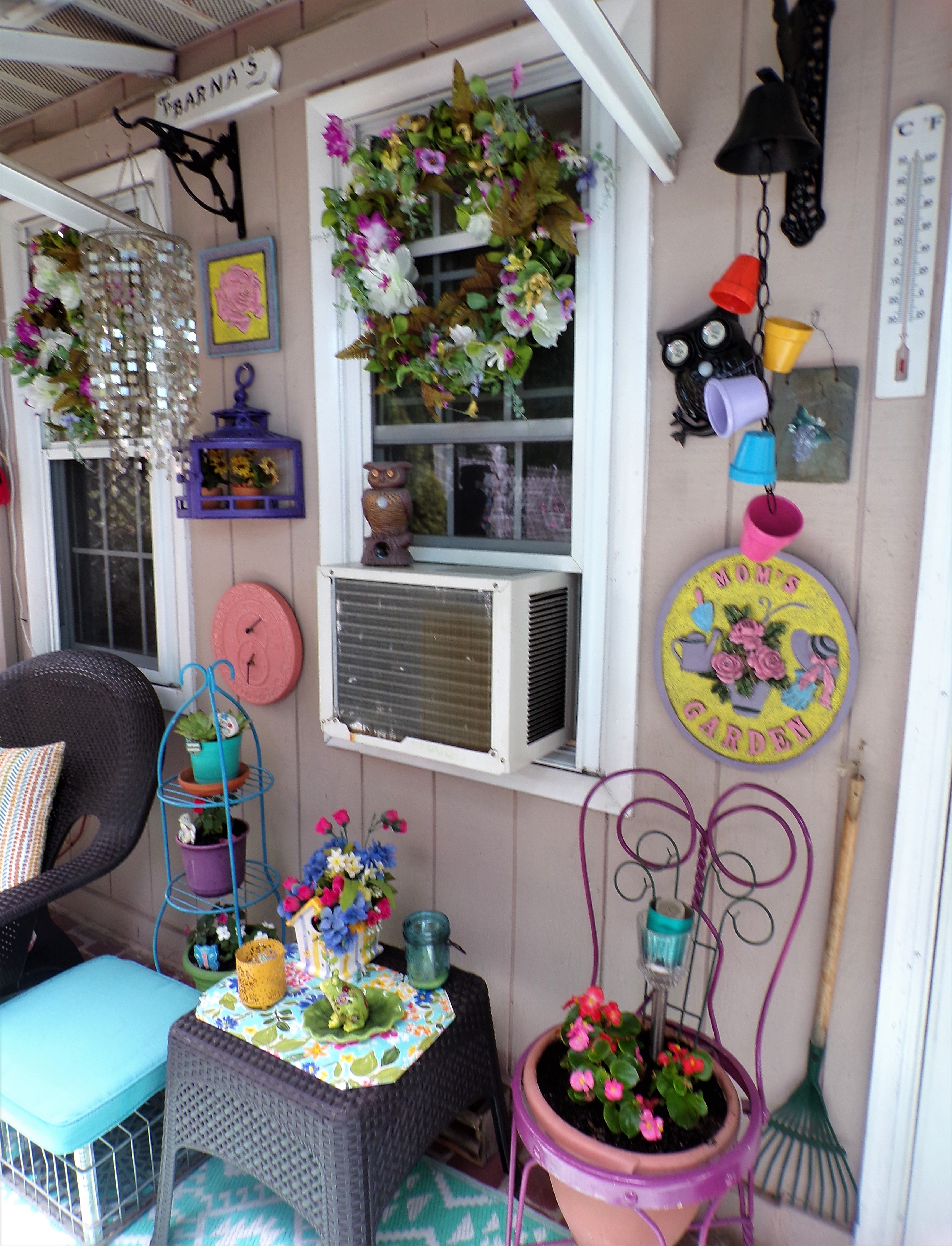 I decorate the Patio in bright colors with a more whimsical theme than on the Front Porch.....