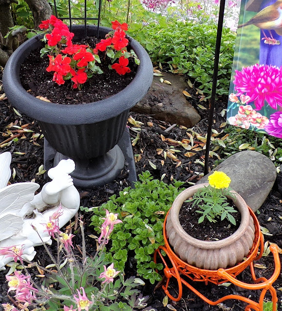 I planted 4 impatiens in the corners of the larger pot and one marigold in the smaller one.....