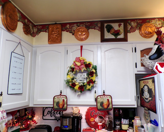 Today, I am picking up where I left off in my tour of the Kitchen decorated for Early Summer in a Hens & Roos along with Bees theme.....
