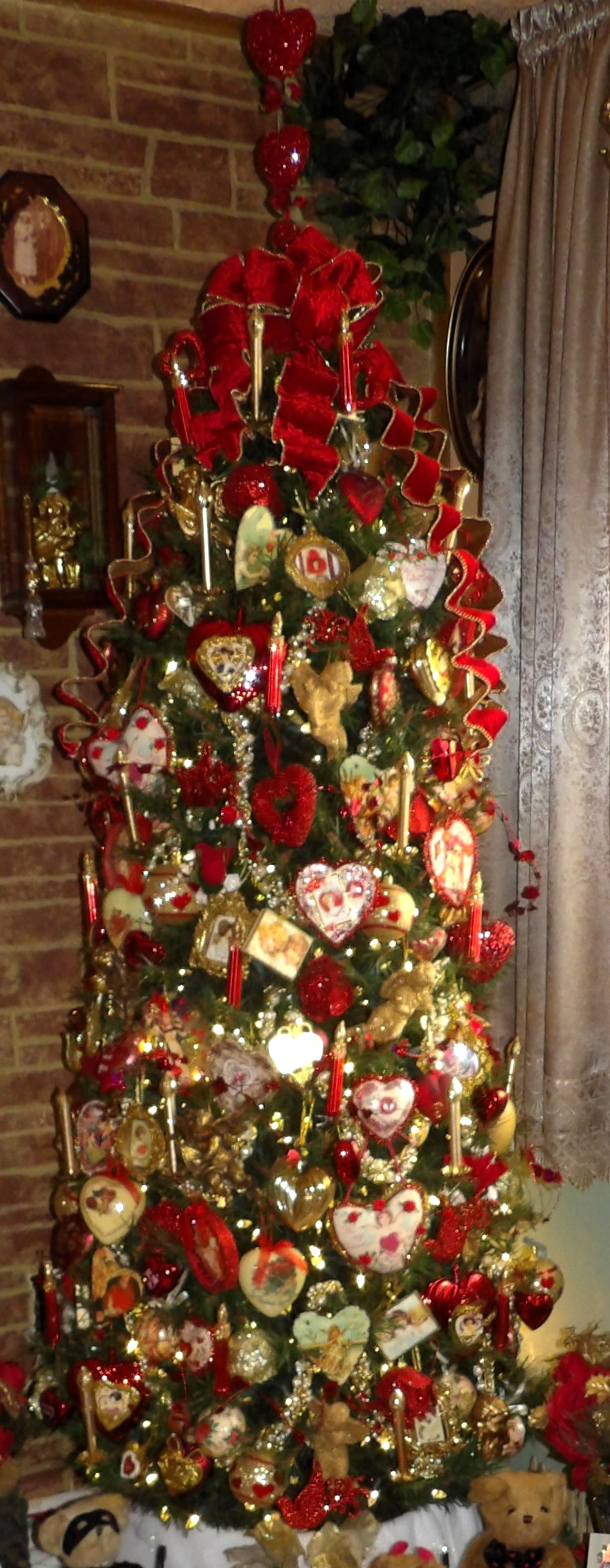 I decorate the Tree in mostly red and gold hearts for Heart Month/Valentine's....
