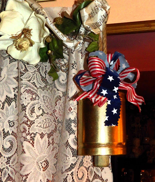 I made bows using a red and white stripped ribbon and I cut strips out of the fabric from an old Patriotic blunting....